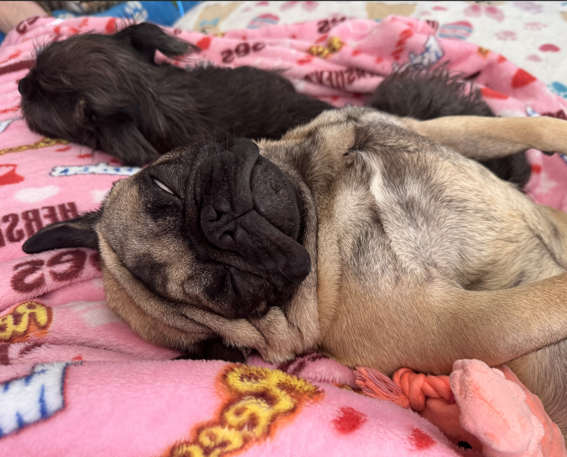 She’s great with kids (her foster has a teenager, but she’d likely do well with younger children too), gets along with cats, and loves playing with other dogs. She’s especially fond of her foster’s puppy, while also being gentle and respectful with their 15-year-old senior pup.