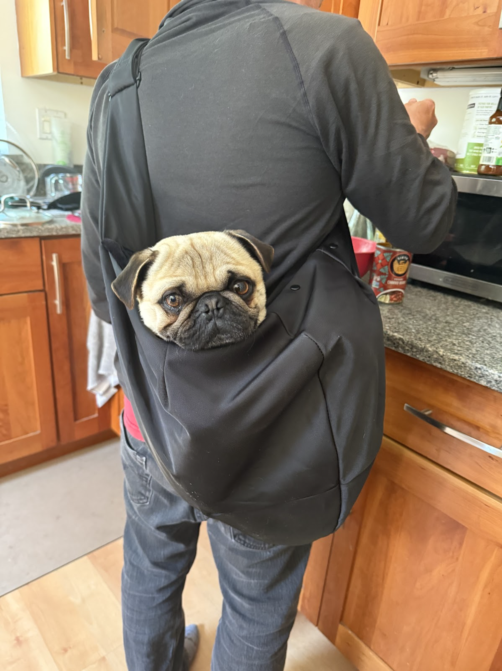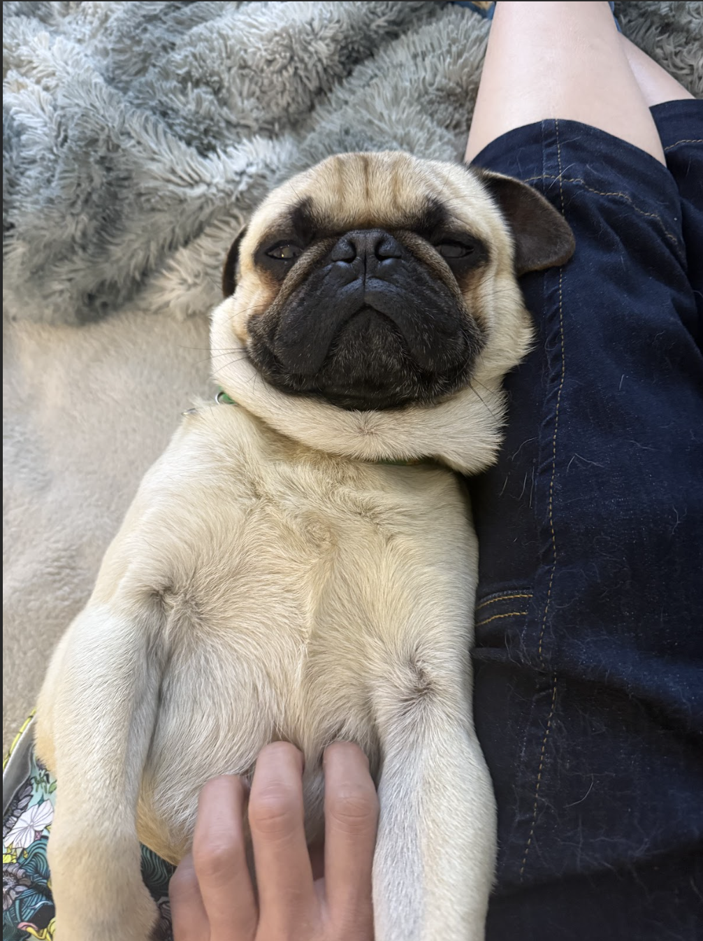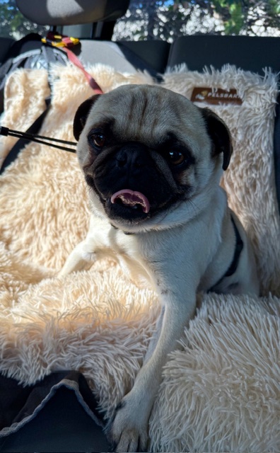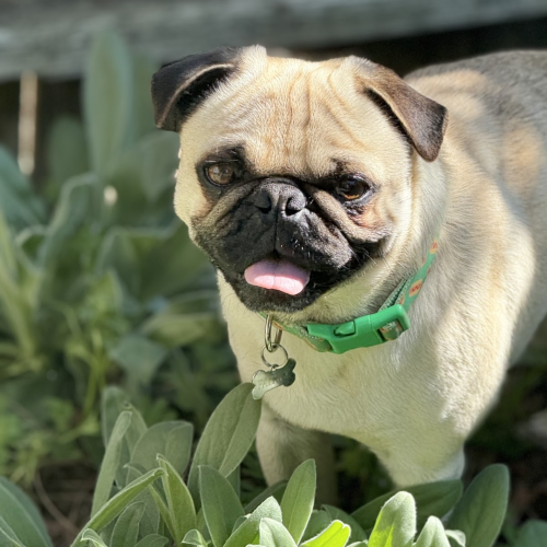 His foster lovingly calls him Teddy, like the teddy bear that he is, and more than anything, he wants to be loved and cuddled by his people. He adores head scratches and neck rubs and will gently place a paw on you if you stop, just to ask for a little more. A classic velcro pug, he happily follows his person from room to room and has no concept of personal space. He does well with other dogs and kids, but his favorite place is right next to his person.