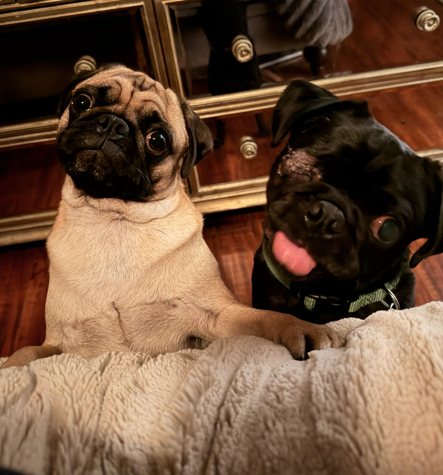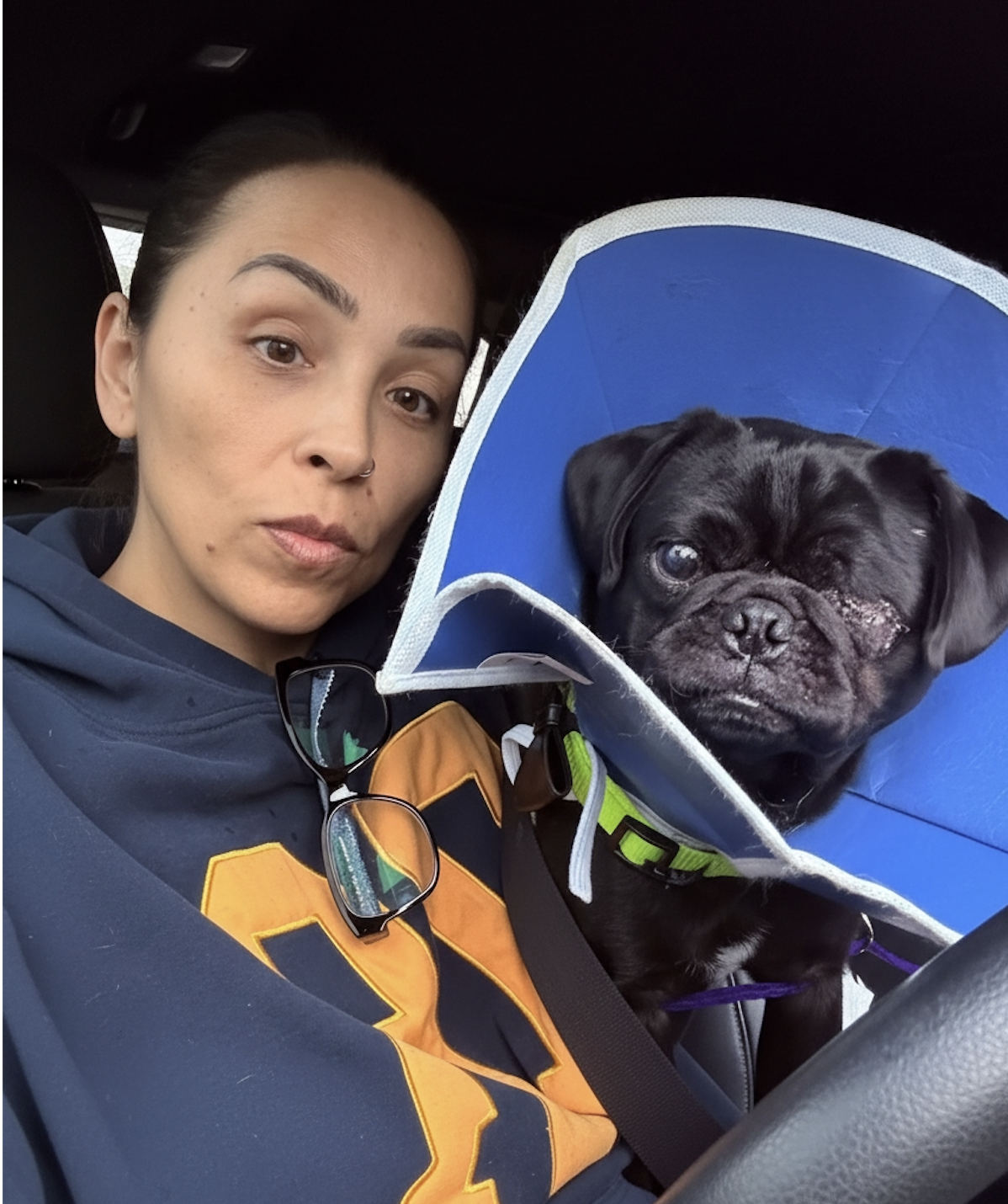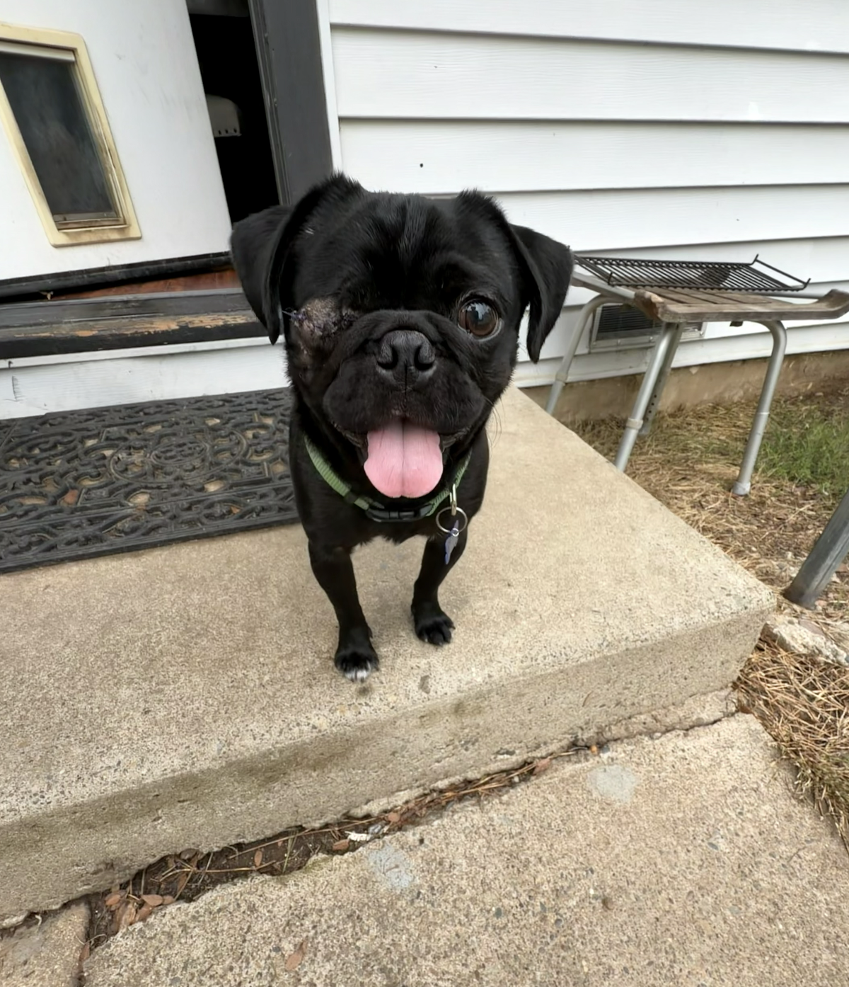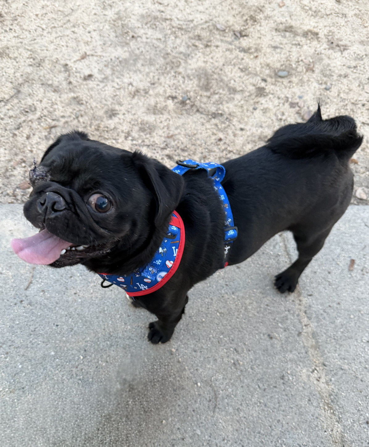 He’s fully potty trained, incredibly social, active, and endlessly loving. He has a playful, puppy-like spirit and loves to give gentle “love bites,” so in a home with young kids, he’ll do best with supervision and guidance to help everyone learn how to interact respectfully with a mouthy, playful pug.