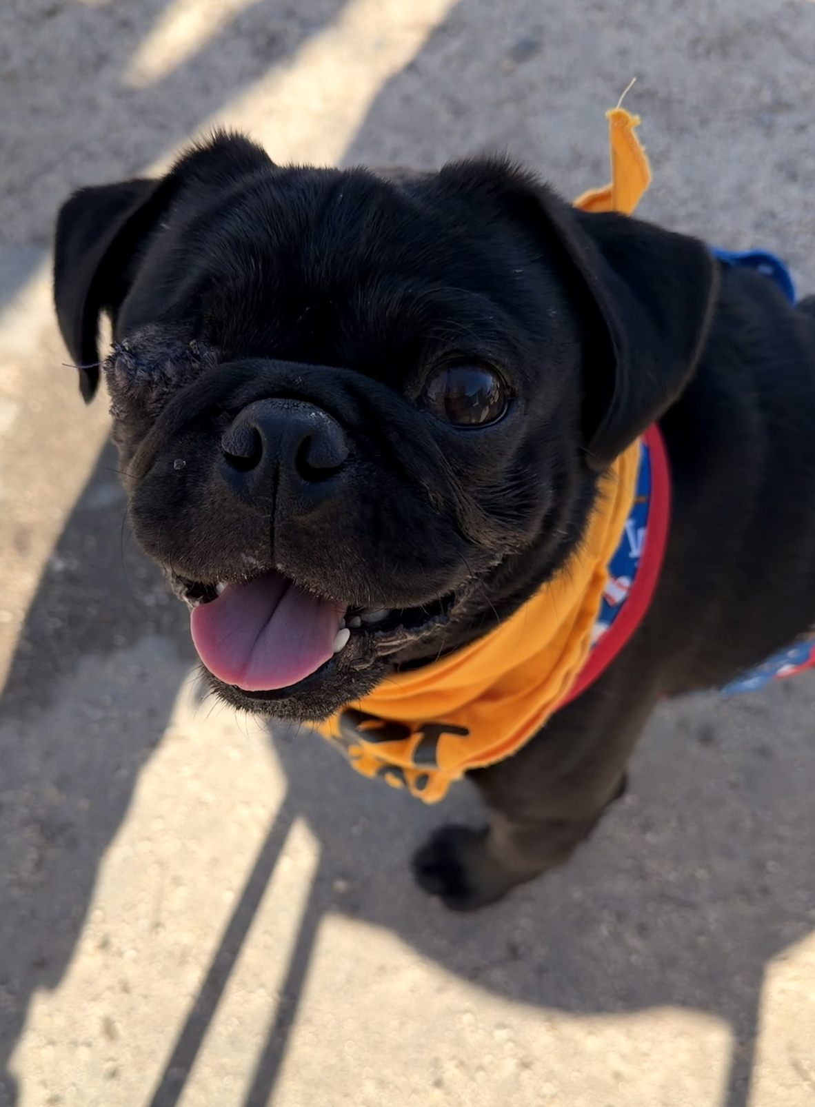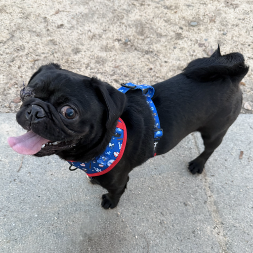 At the dog park, he’s the life of the party, happily playing with everyone and confidently ruling the scene. He adores his toys, enjoys a good play-fight, and thrives with canine companionship. He especially loves spending time with his foster pug siblings, so a home with another dog would be ideal for him to grow and play alongside.