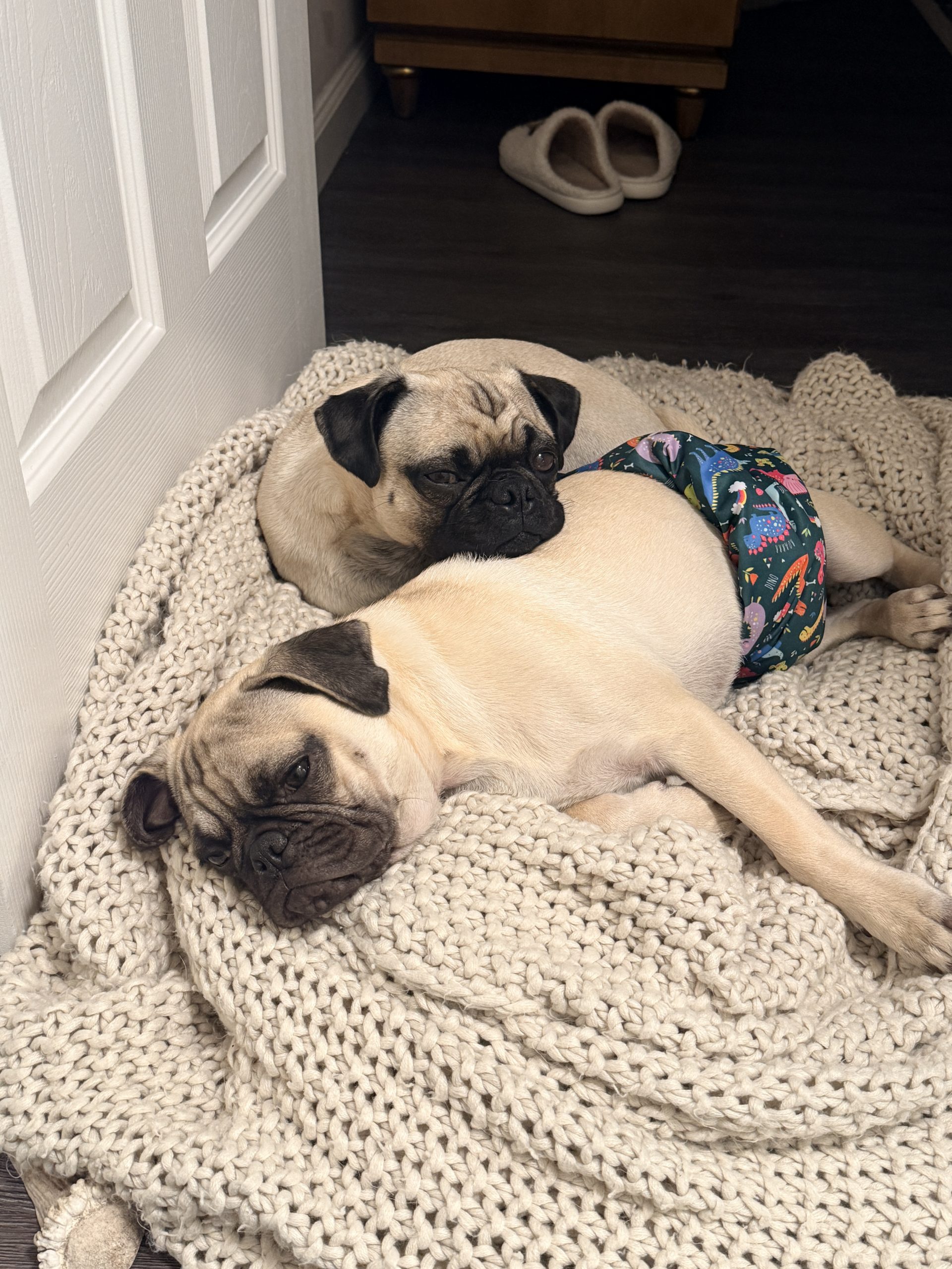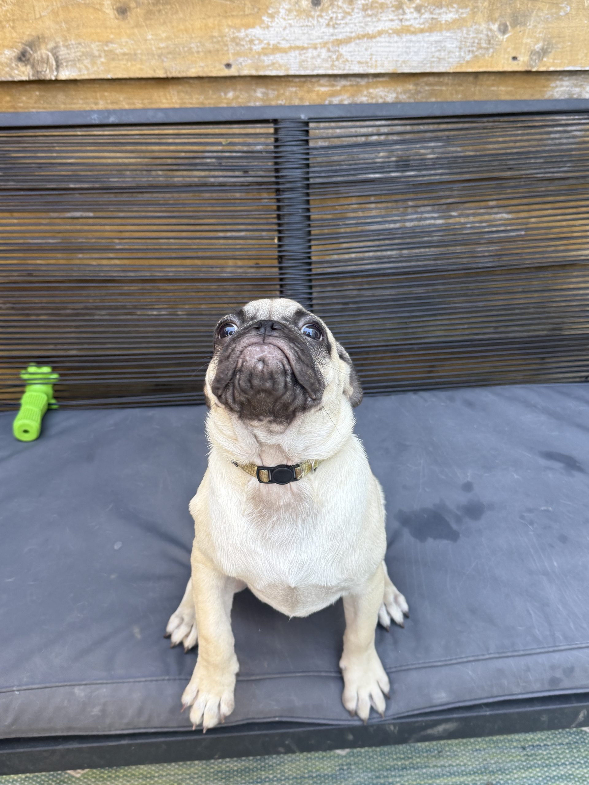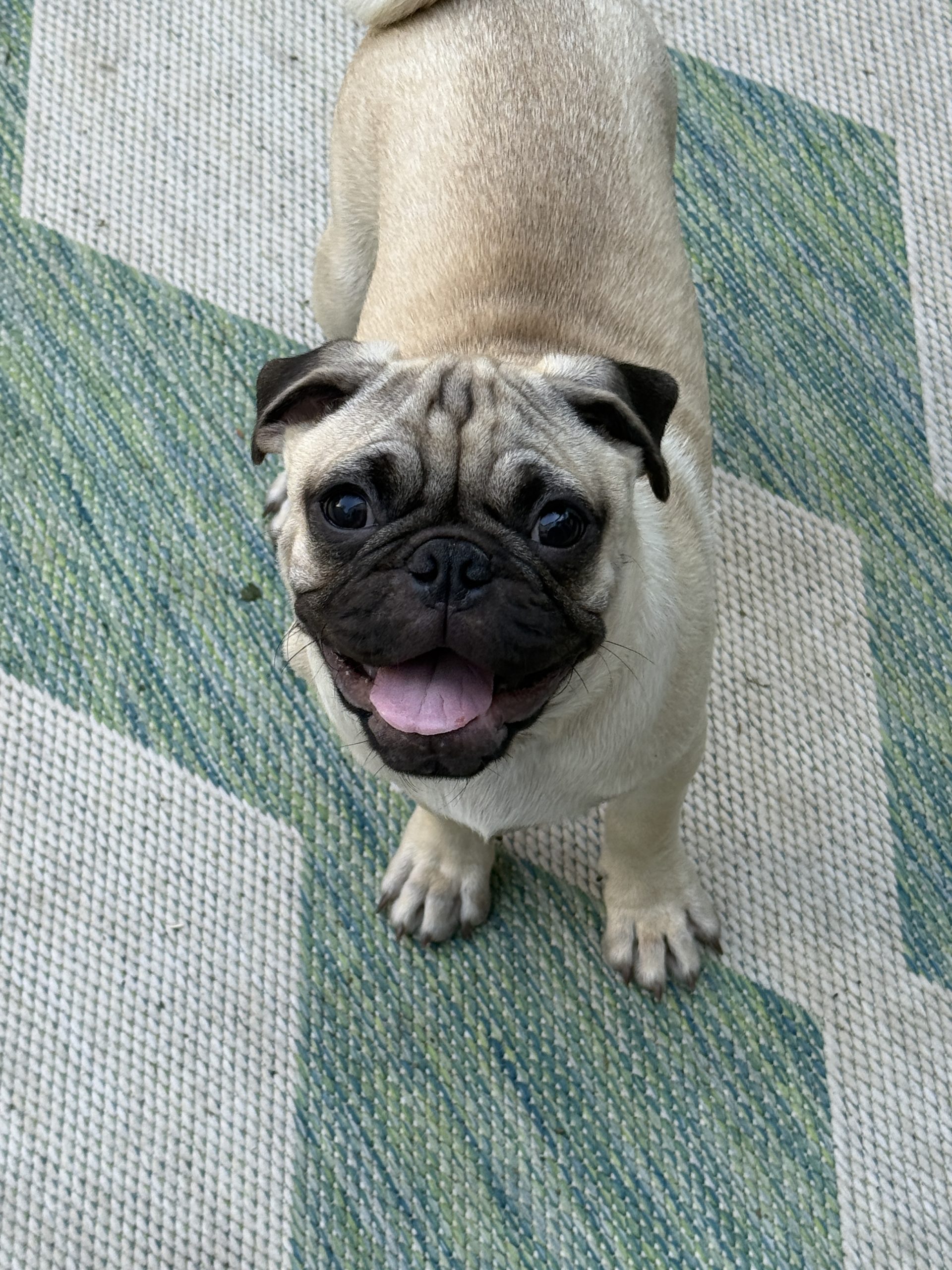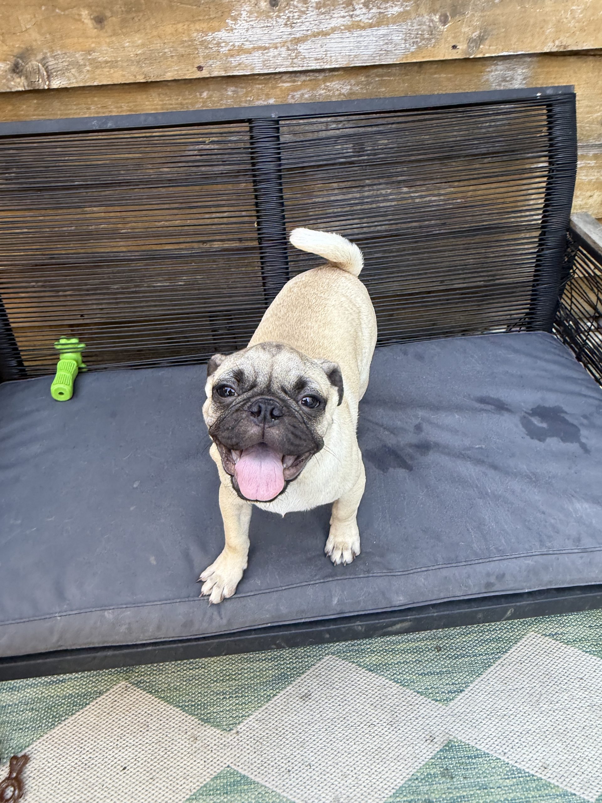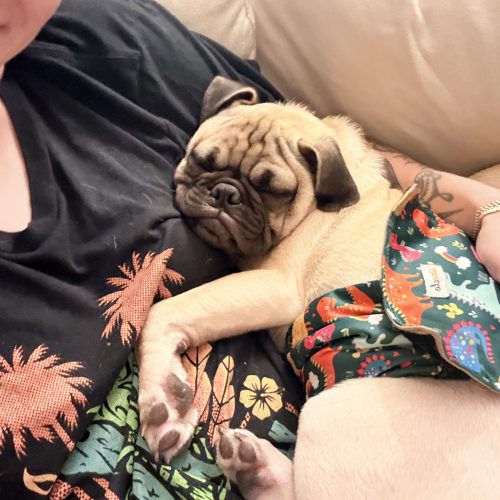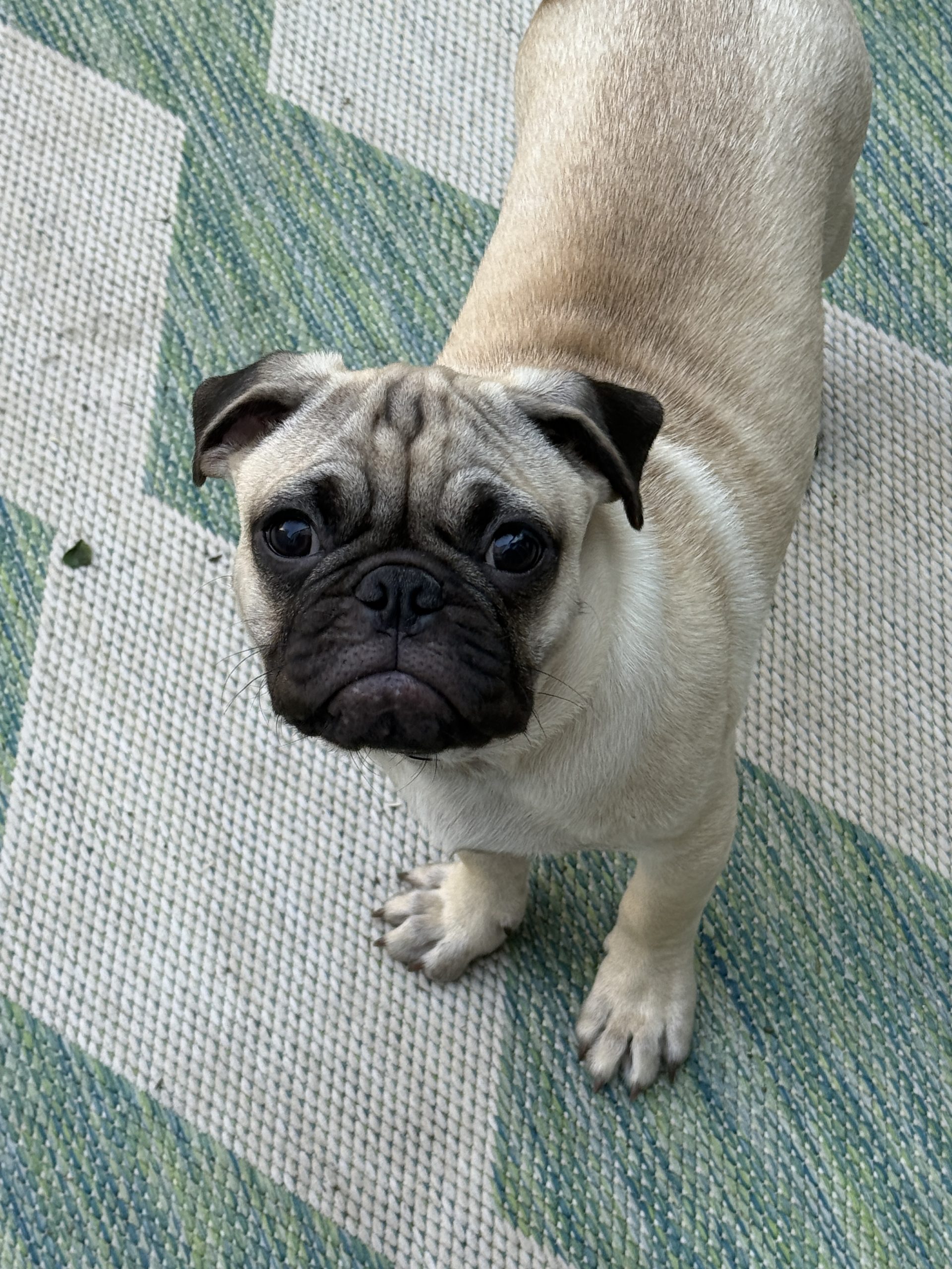 Chili's is an adorable and sweet boy. He loves to be cuddled and to play with other dogs. He's social and friendly, and he'd make a great addition to any home. He's potty trained to go outside on a porch potty or a pee pad. He is microchipped and fully vaccinated, and we will get him neutered on Oct 24. He came to our rescue with four of his siblings as part of an accidental litter surrender. Chili's is a big puppy, with big paws and lots of wrinkly pug skin!