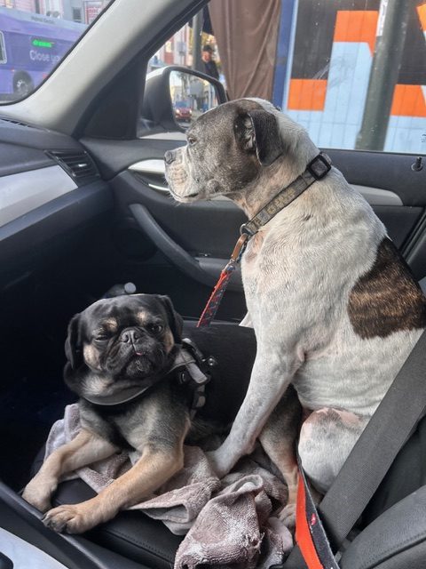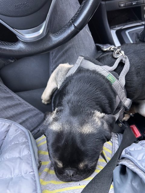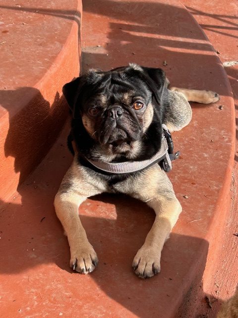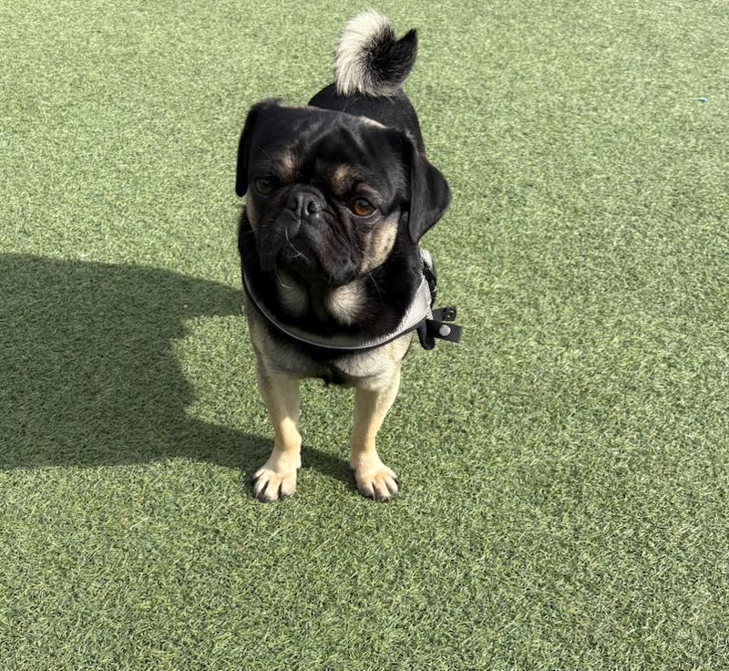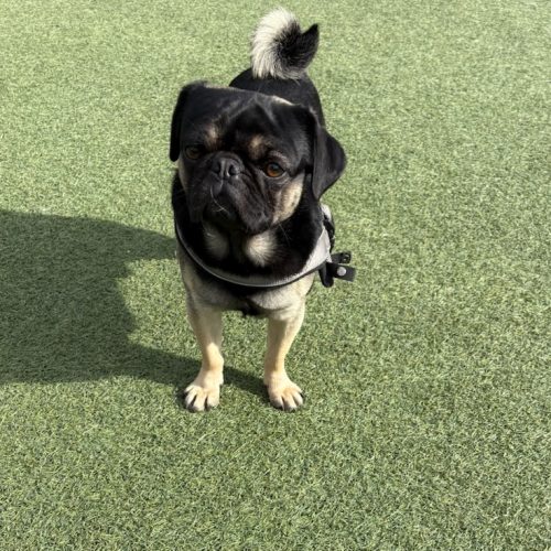 This cute guy is estimated to be under 2 years old and came from a rescue that closed down in Northern California.  He has the unusual pug coloring that catches your eye and the sweetest disposition!  He is fostered with other dogs and doing great, loves to play at the dog park and is a social butterfly.