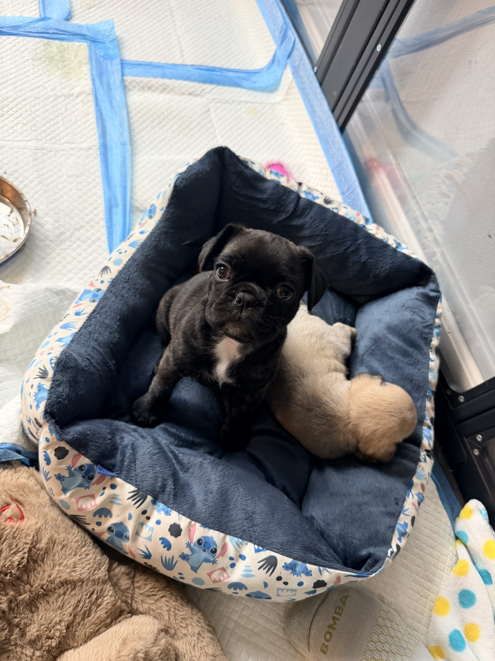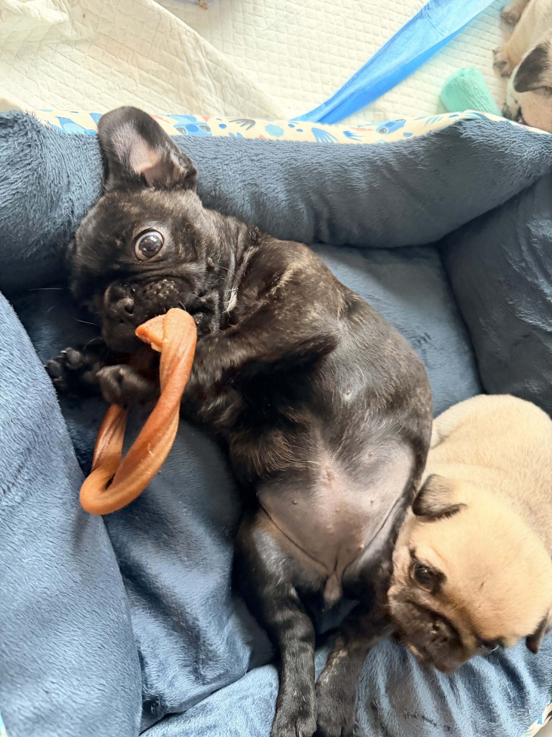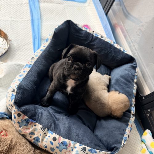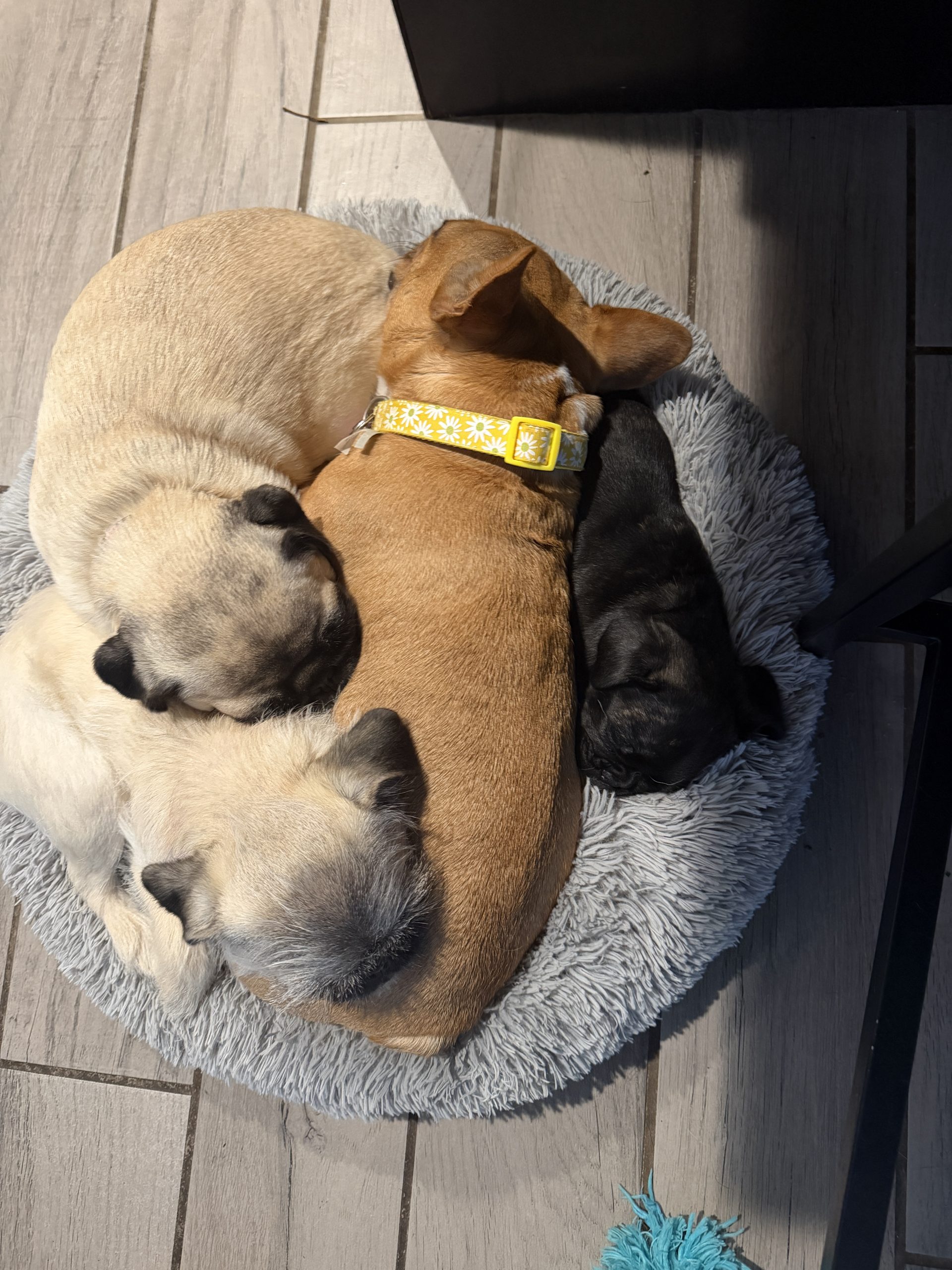 Evelyn — or Evie, as we like to call her — is a petite little bundle of fun. We suspect she’s about 25% Frenchie based on her sturdy build, expressive face, and big personality, but she absolutely has the pug traits we all know and adore. She’s your constant shadow, loves snuggling with her foster siblings, curls up beside you at night, and brings endless playful energy to every day.