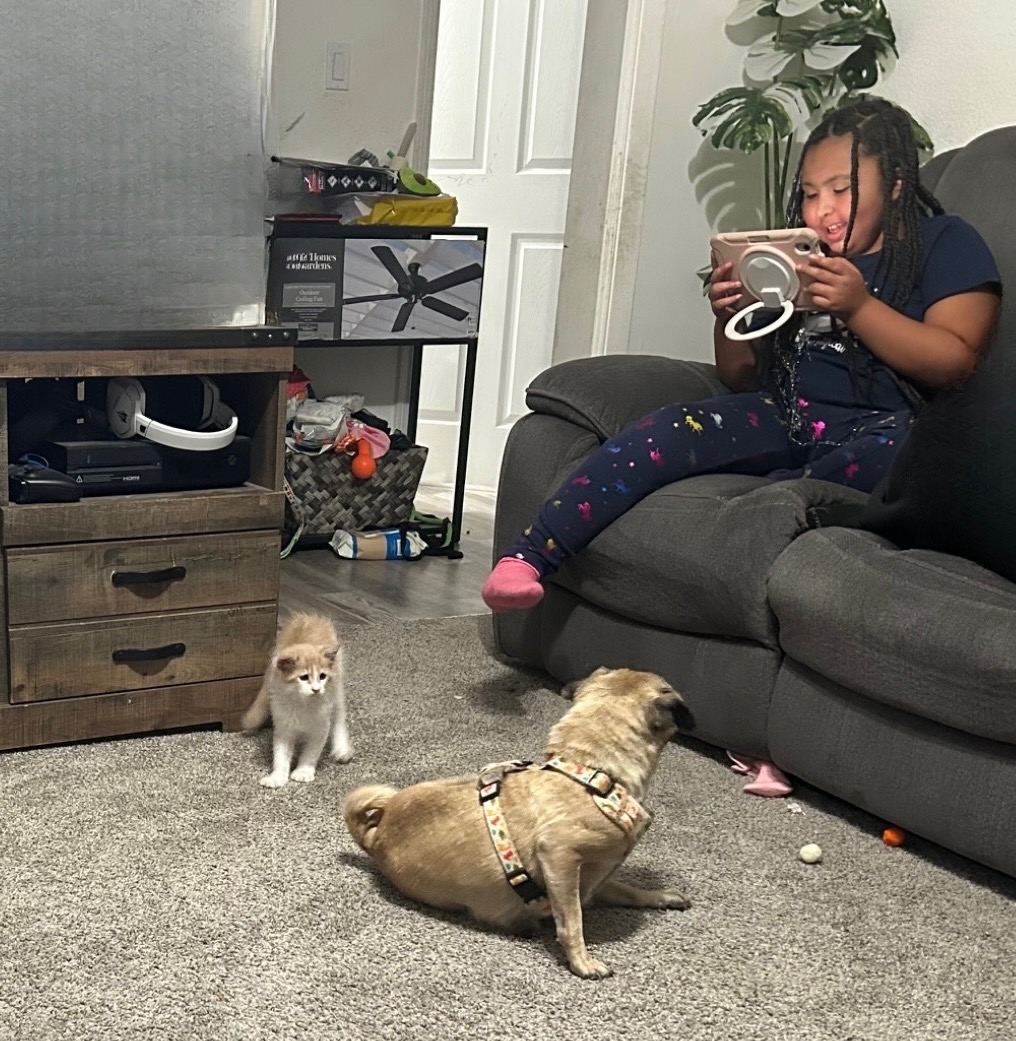 Horchata is wonderful with children, gentle and playful with a kitten, and relaxed around large dogs. She’s potty trained, enjoys her walks (especially when she can “roo” at butterflies), and is perfectly content entertaining herself with a nap or some toys. She loves watching dog TV and being near her people.