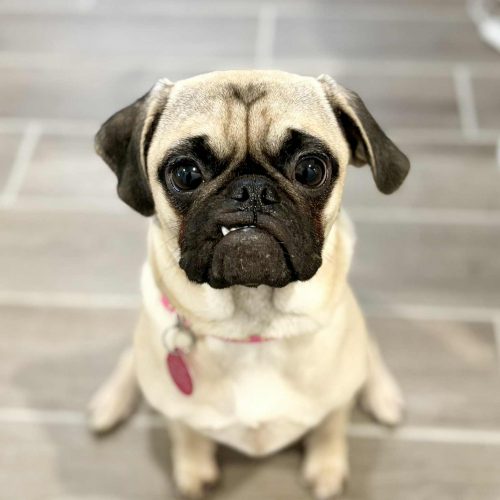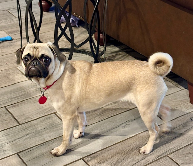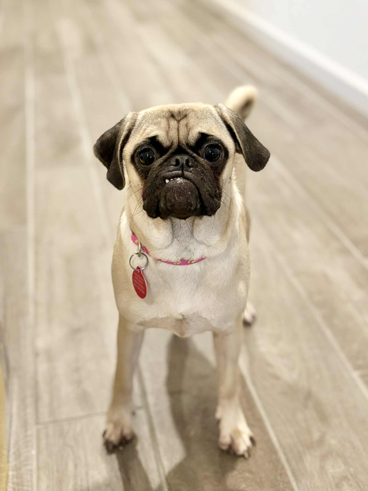Iris is about a year old, weighs 20 pounds, and has a confident personality. She does well with male dogs or could thrive as the only pup in the home (many female pugs are like that!).