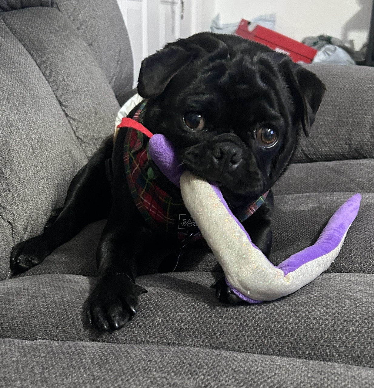 Kiké is friendly, playful, and an all-around good boy. He’s crate trained and improving with potty training every day. He does wonderfully with kids, dogs of all sizes, and even cats. Playtime is one of his favorite things, especially when plush toys are involved, and his happy personality makes him a joy to have around.