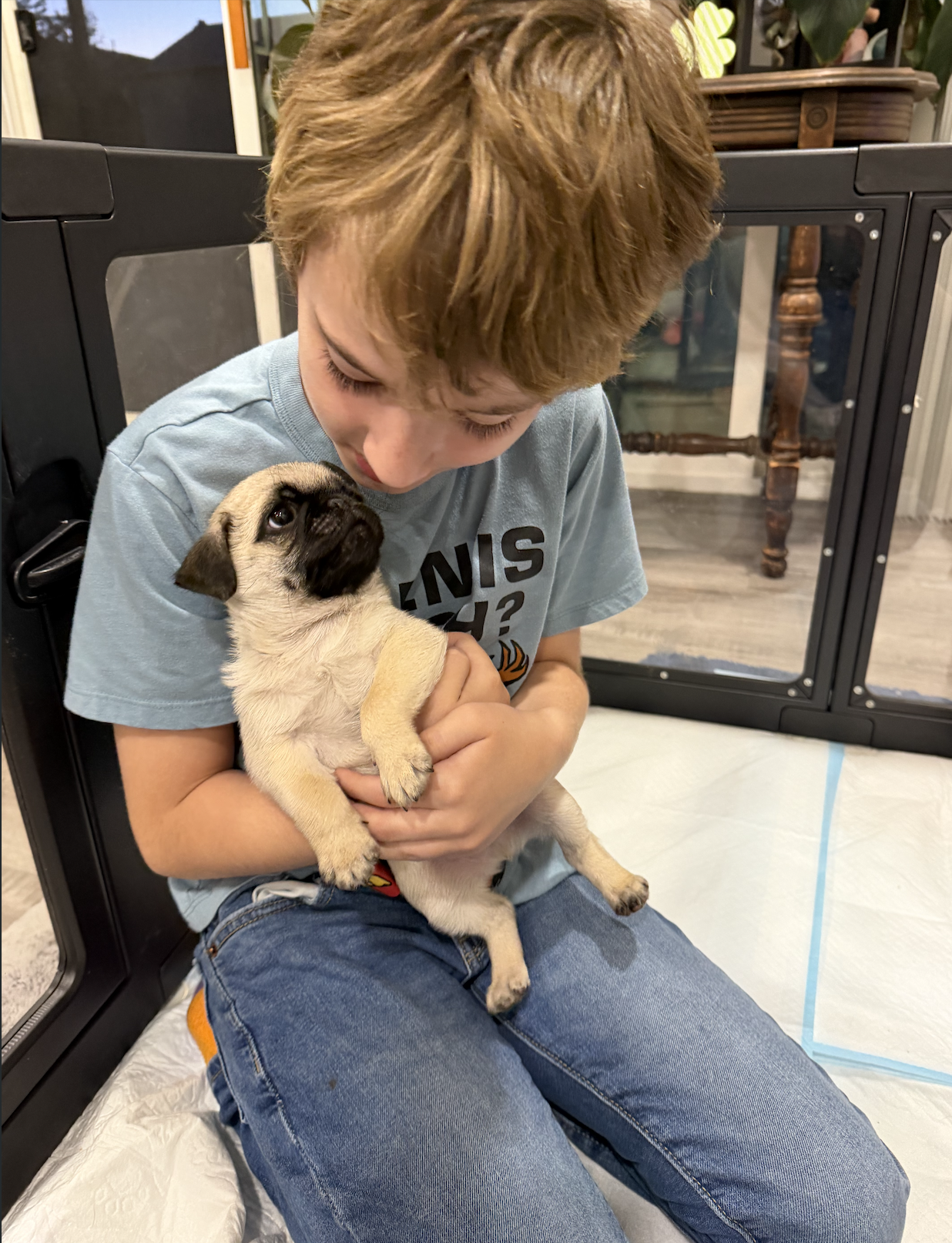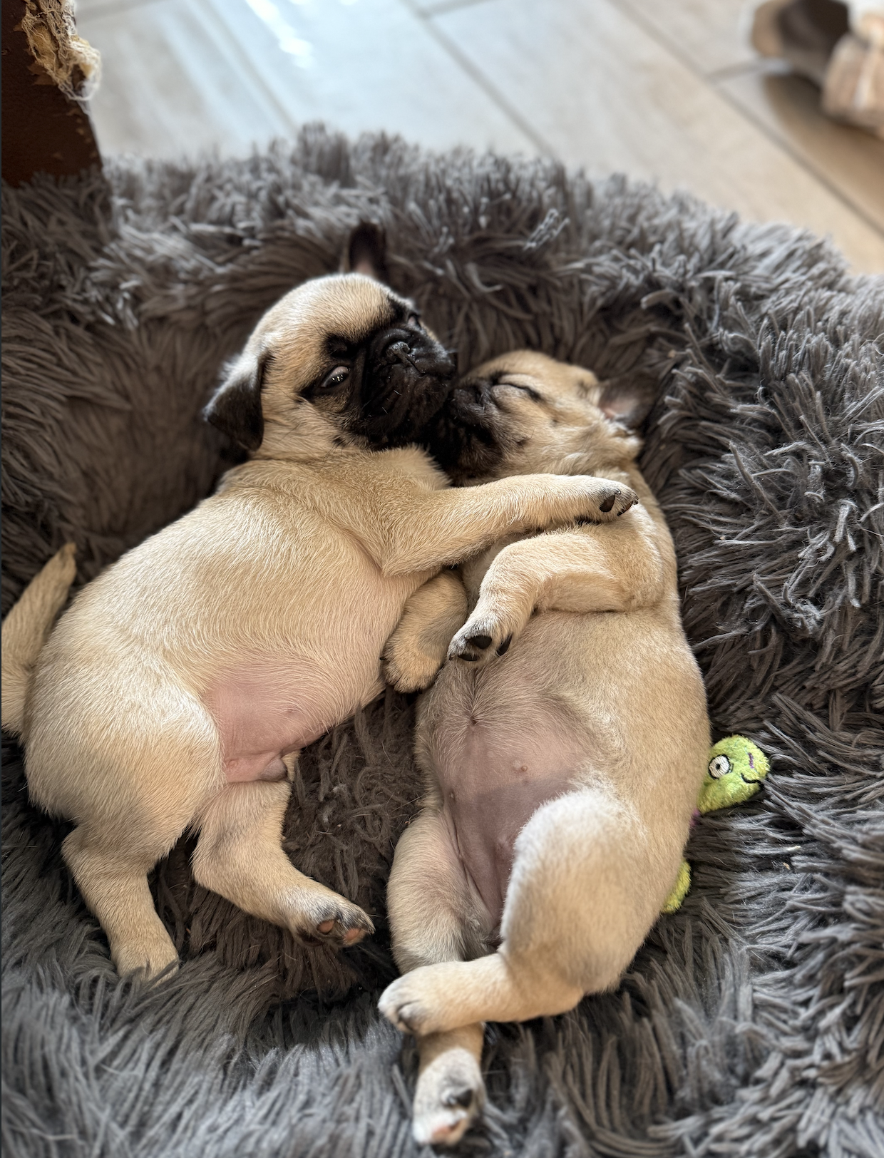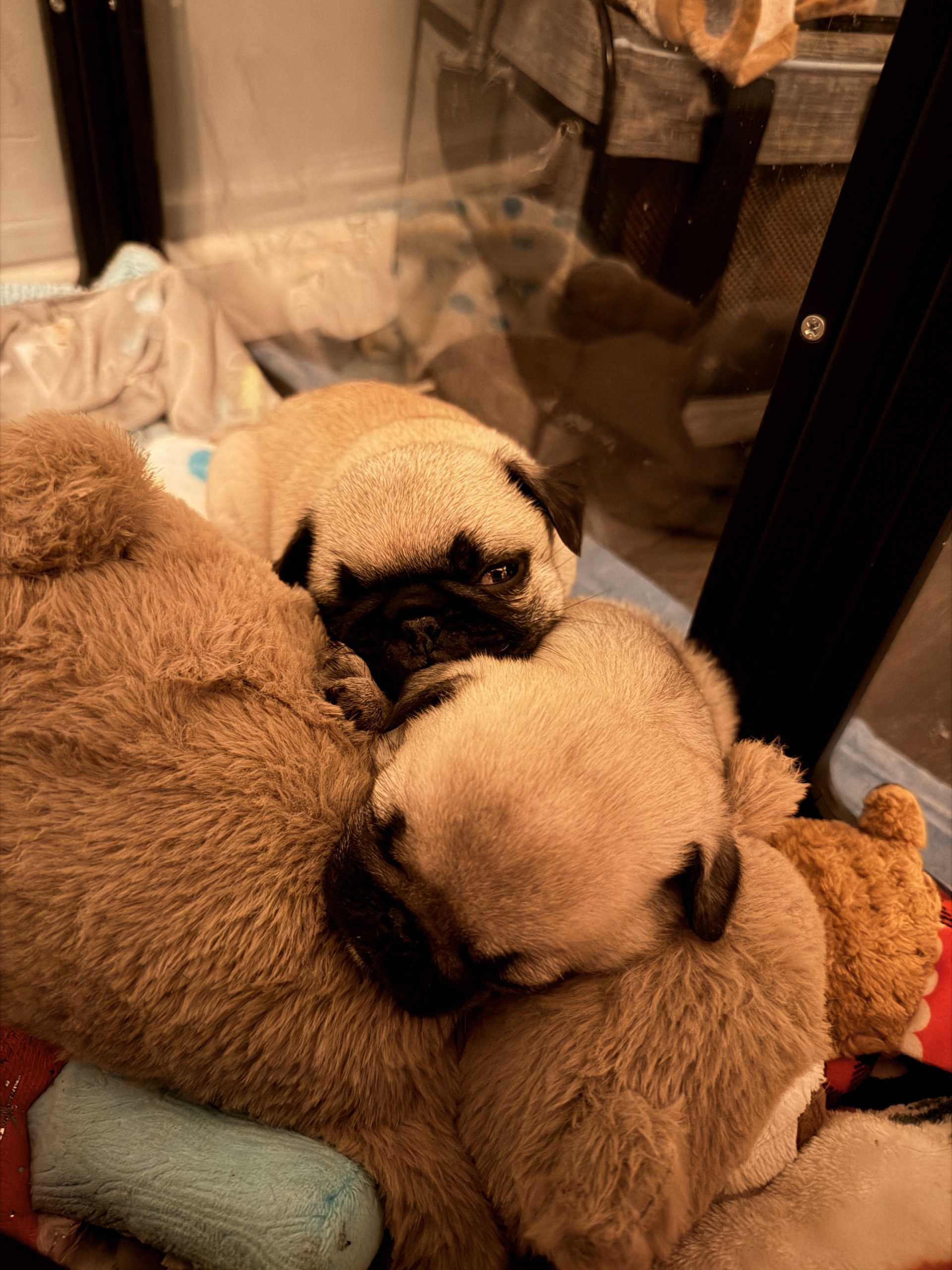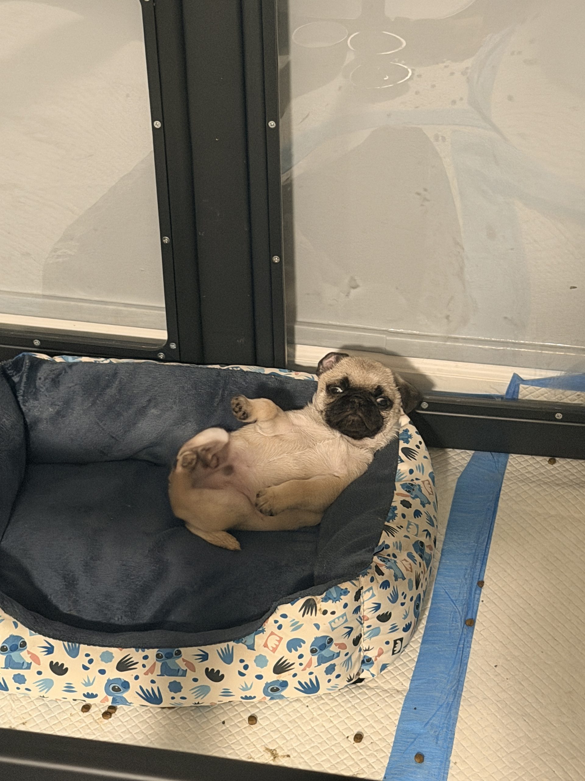 For his first five weeks, he was the only puppy, but he found companionship with Matilda, a disabled puppy we also took in. He truly blossomed with her, learning how to play, cuddle, and just be a puppy. He also spent time with adult pugs, chasing their ankles, stealing their toys, and taking corrections well. He's currently being fostered with a human baby and child and doing really well around them.