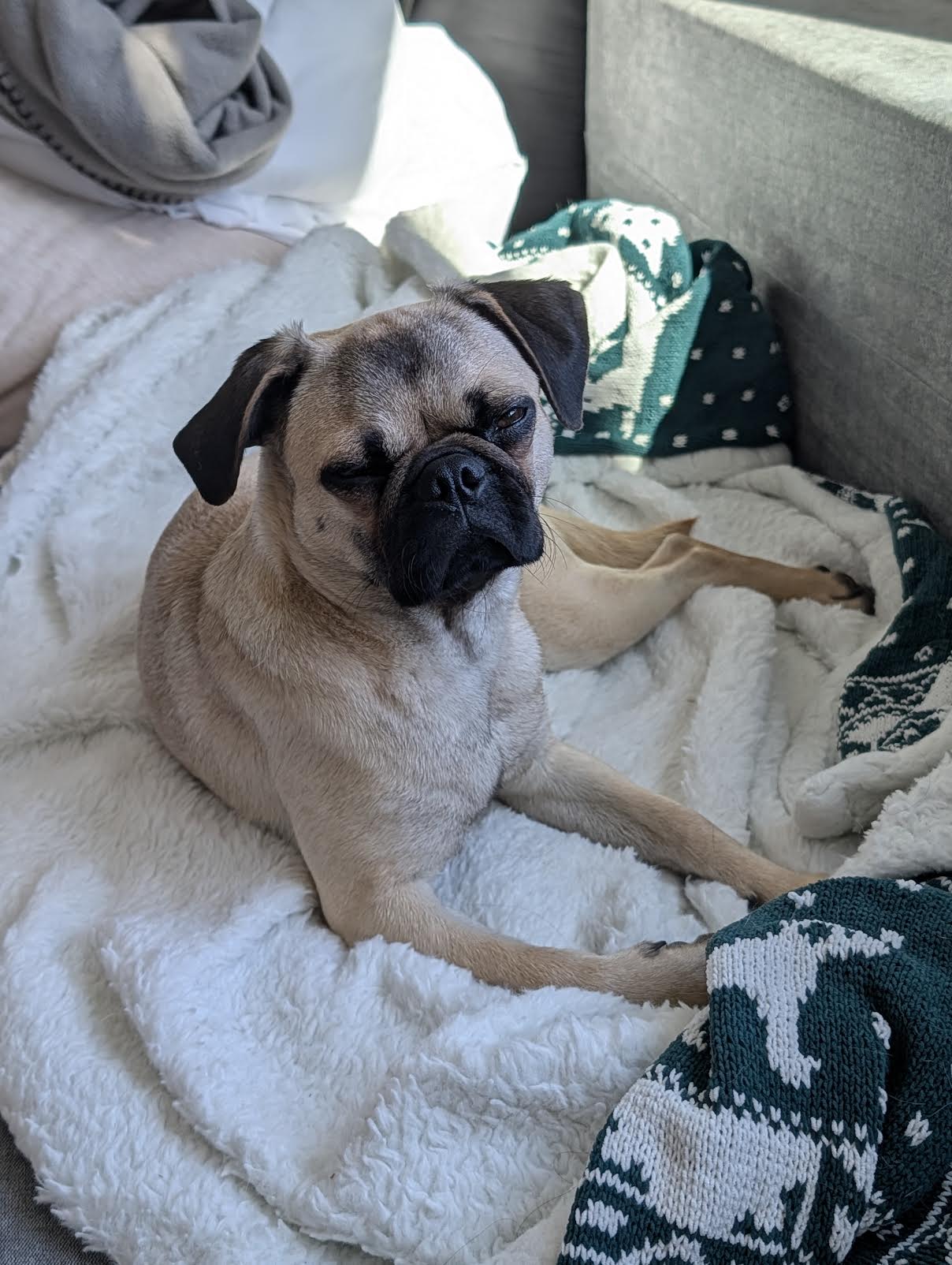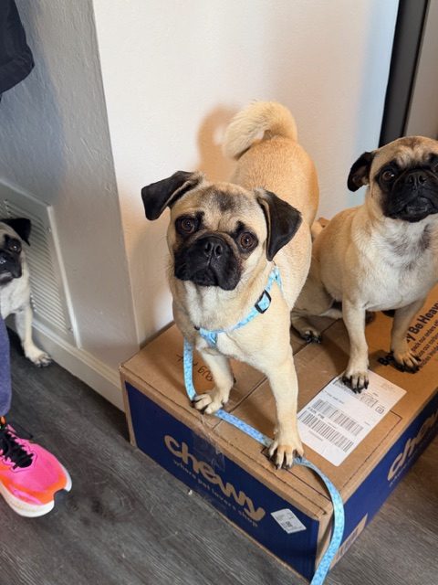 She still has some puppy spirit and curiosity, especially on walks where she happily takes in all the sights and smells. Lorna is doing well with potty training and continues to improve each day. She loves ear rubs, tasty treats, and slow, cozy mornings spent snoozing nearby.