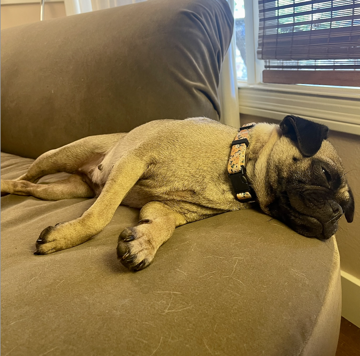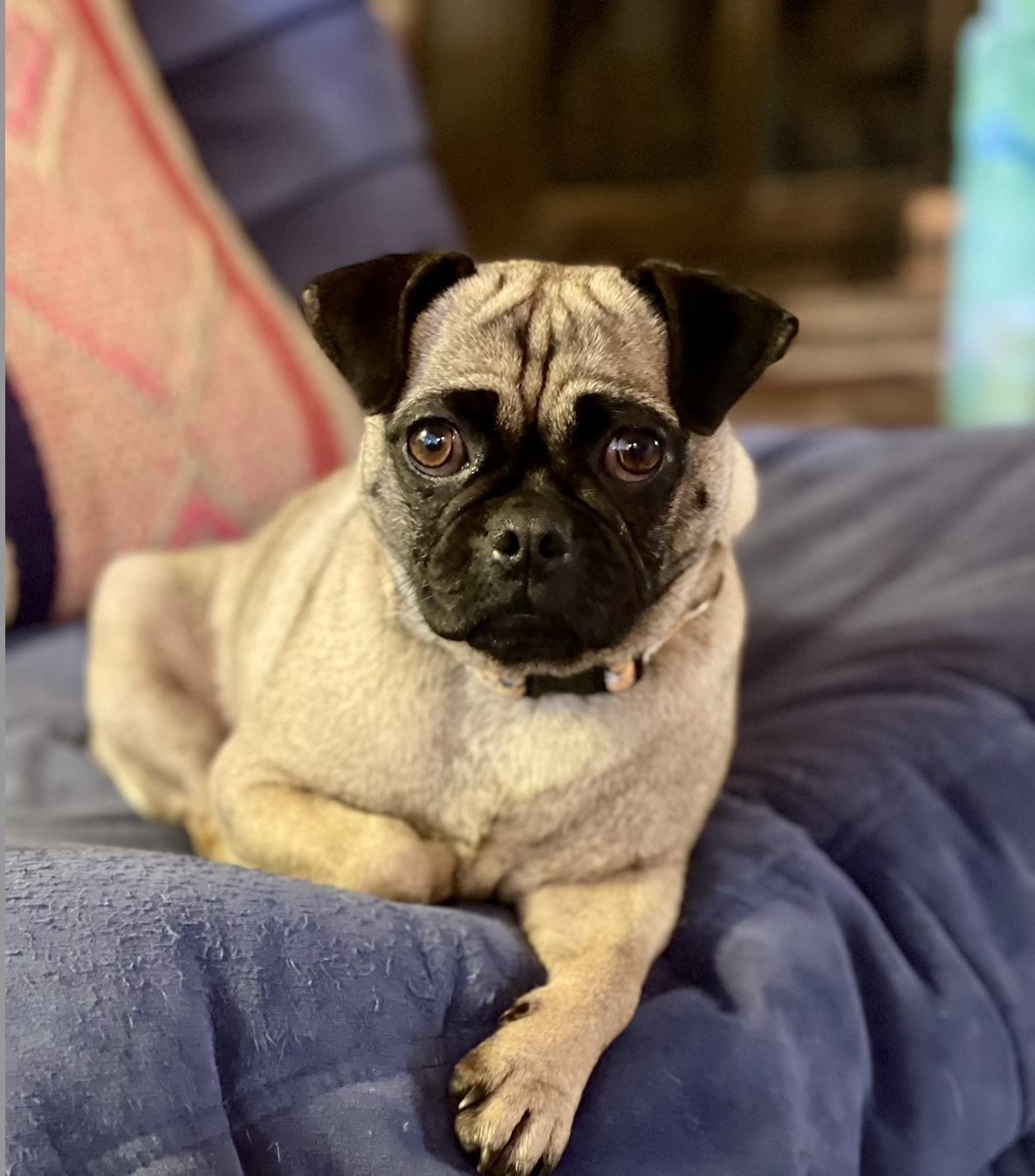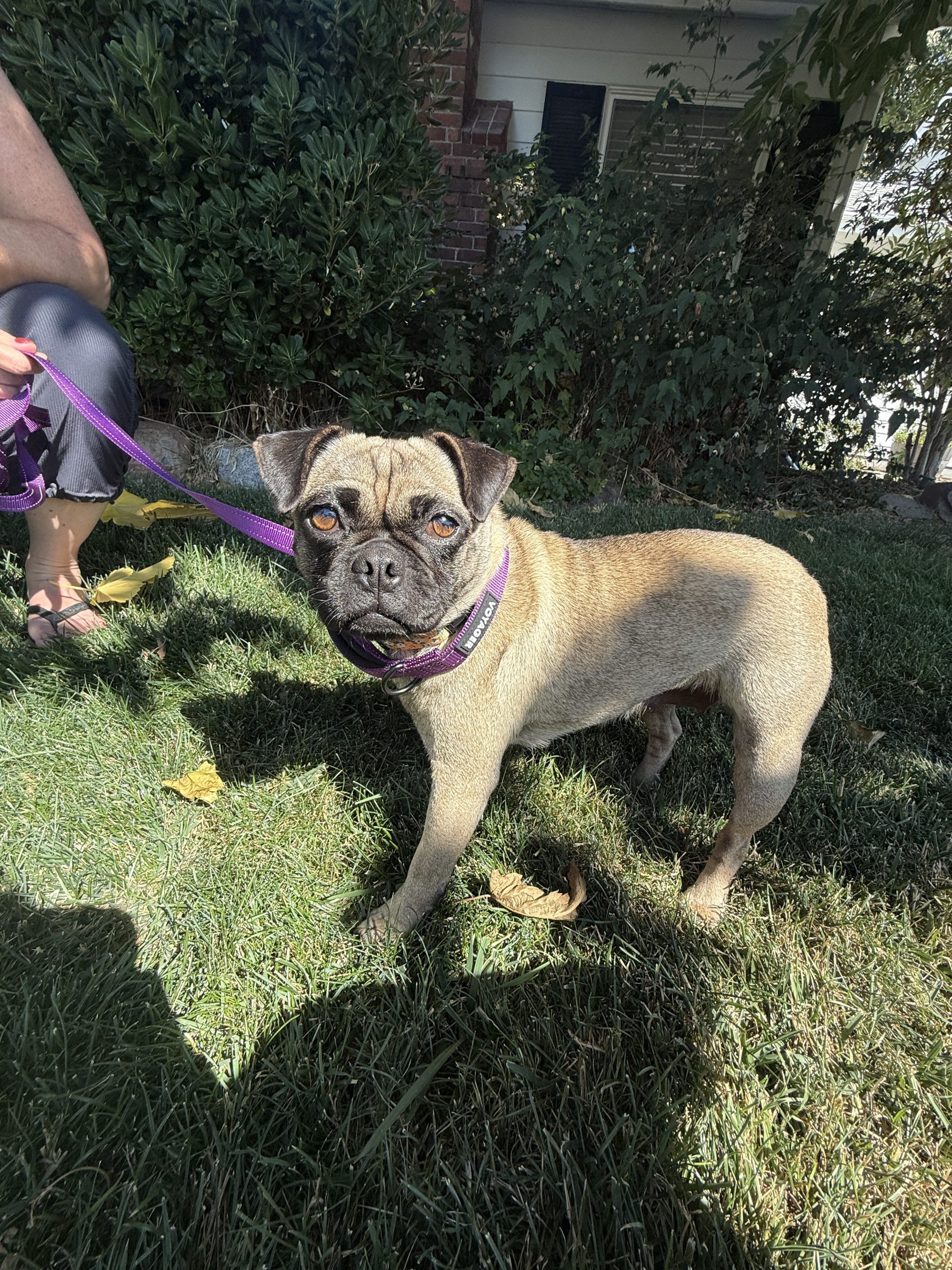 Maple is playful and full of puppy energy, but she also knows how to settle in for a good pug-style nap. She’s already potty trained, knows how to sit, and is eager to keep learning. She is working on her leash manners since she loves saying hello to everyone she meets, and she is responding beautifully to training.