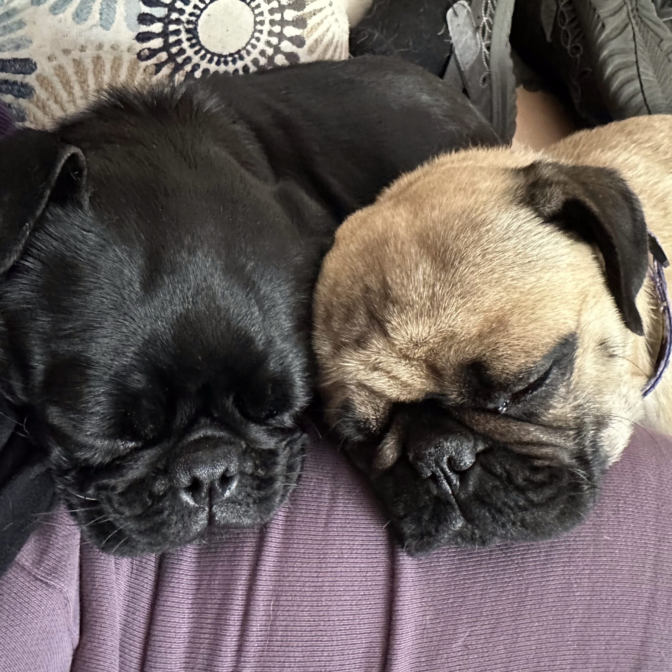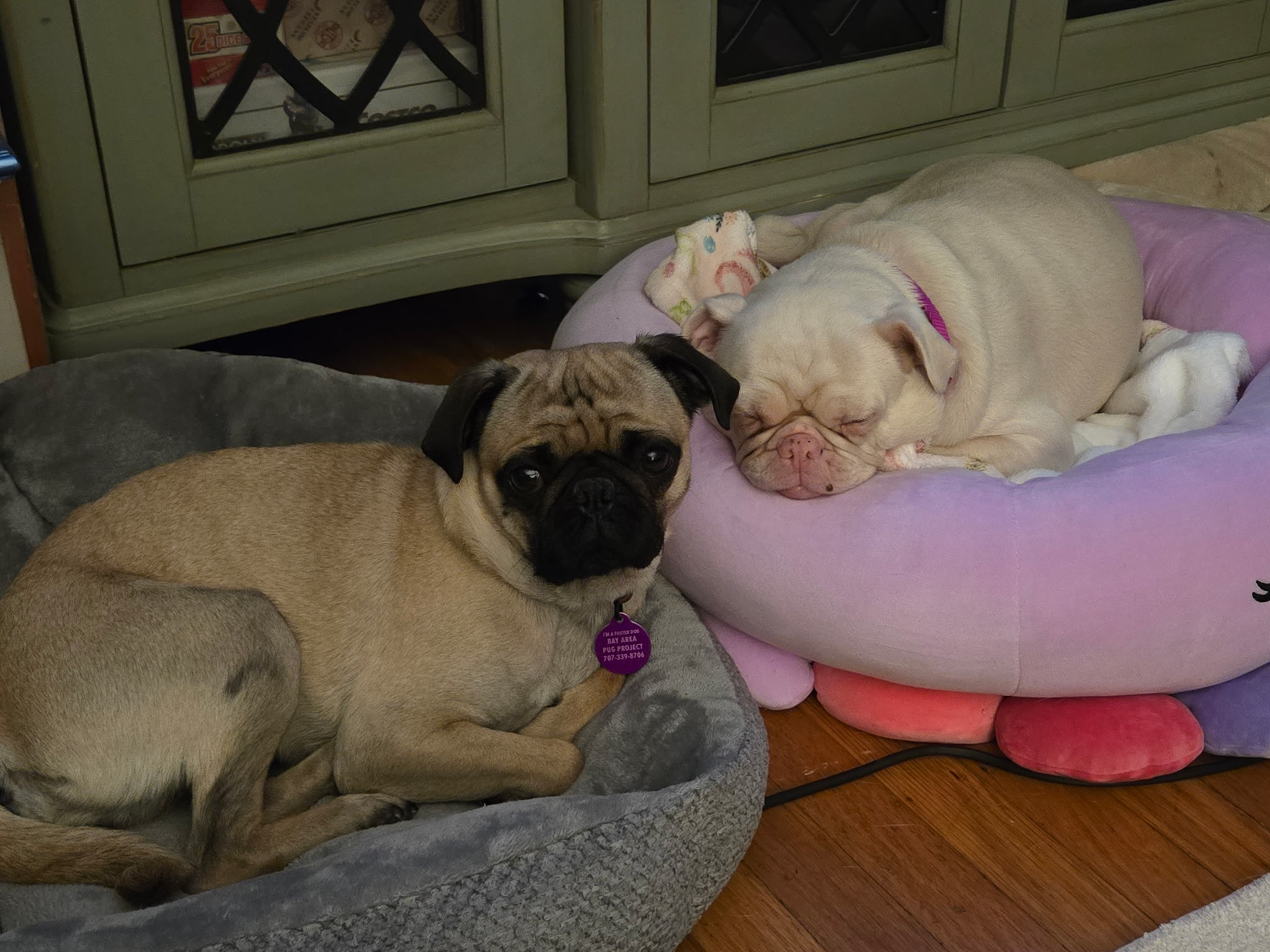 Mercedes loves to end the day in a big pug puddle, curled up with another furry friend and her people. She’s also a little chatterbox, with an endless repertoire of snorts, grunts, and playful barks to make her opinions known.