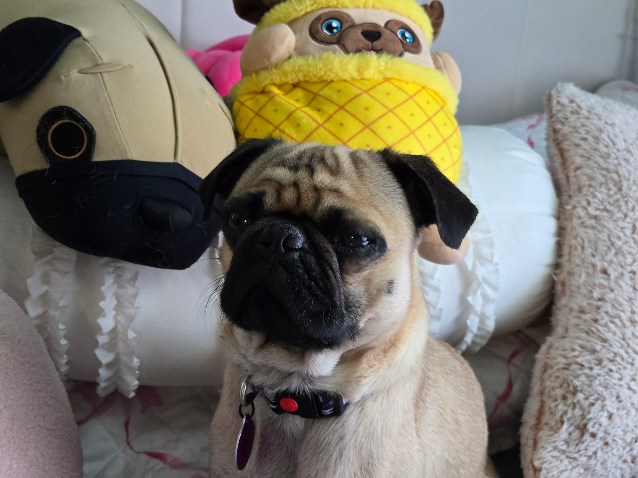 She gets along wonderfully with dogs and cats alike and would thrive in an active home where she can burn off her puppy energy. Like any young pug, her play style is hilariously dramatic: full of grumbles, body slams, and all the goofy antics that make this breed so endearing.