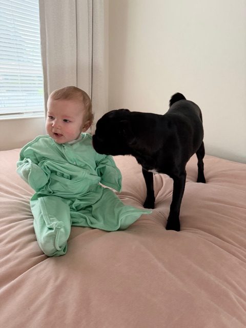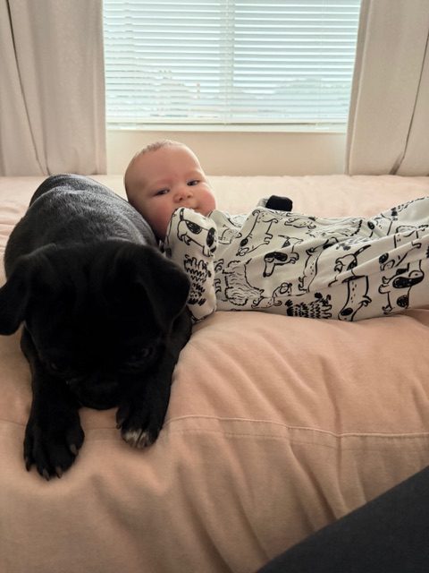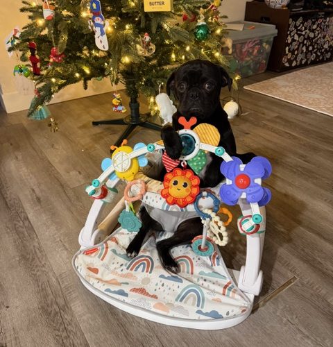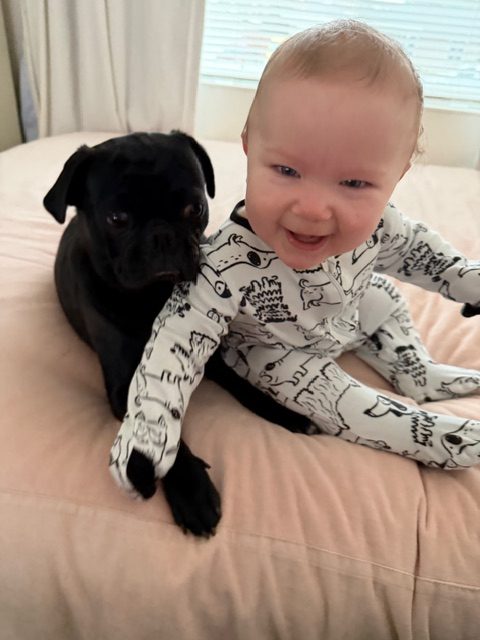 Mickey arrived with his brother as an owner surrender and has been winning hearts ever since. At just 8 months old and a sturdy 22 pounds, he’s a big, goofy puppy who loves toys, wrestling sessions with other dogs, and curling up in any available lap.  He will even cuddle with a baby that's how loving he is!