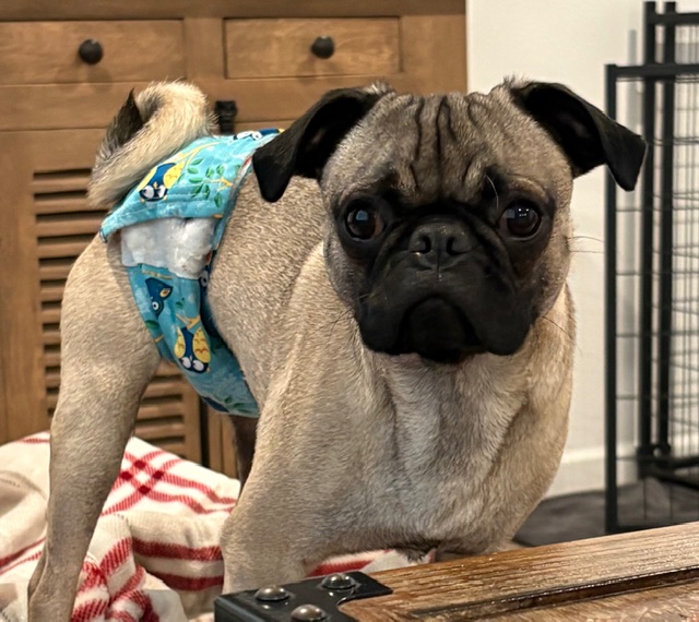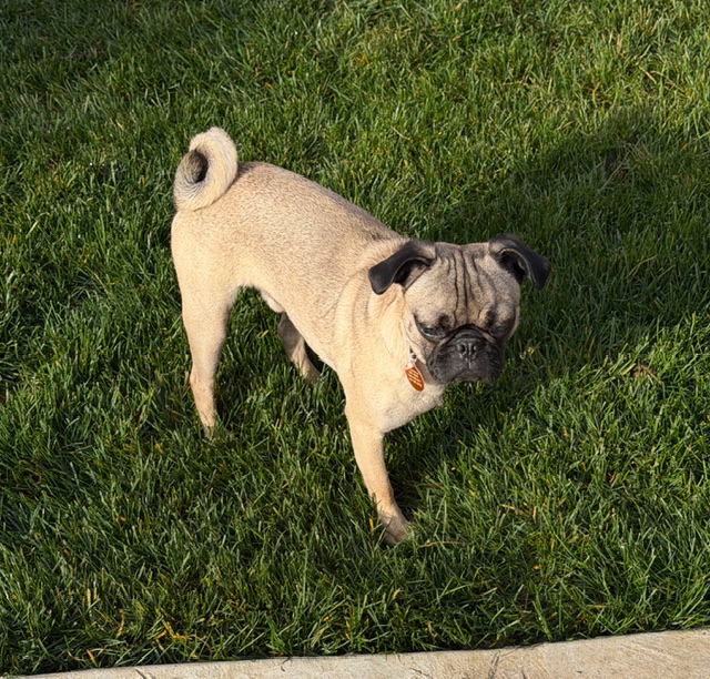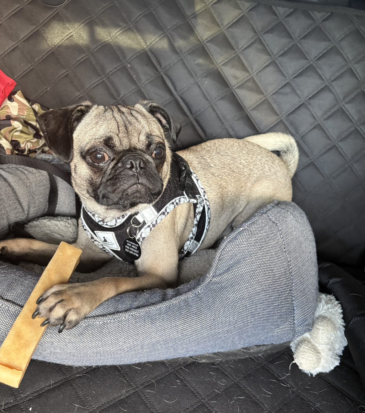 Pele loves to cuddle and prefers to sleep curled up against your chest. True to his pug roots, he’s a loyal little shadow who wants to be wherever you are. He’s learned to use the doggy door and is doing well with potty training, especially with regular trips outside and gentle reminders.