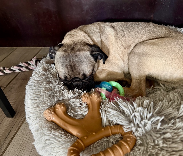 This guy adores his bones and toys and proudly carries them all over the house while he plays. Since he’s still a puppy, an occasional slipper or shoe might sneak into his treasure pile too.