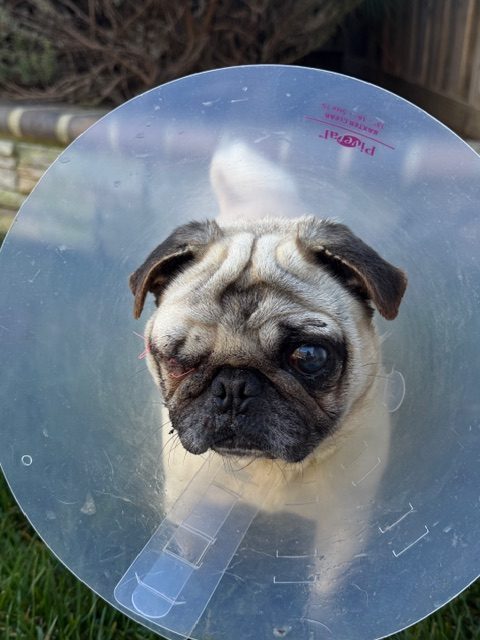 This gentle boy, who we estimate to be about 7 years old, came to us from a Central Valley shelter, just like many of our dogs. When he arrived, he had a severe eye injury and needed surgery to remove his right eye. We also discovered that he has very limited vision in his left eye. But like most blind dogs, Theo doesn’t let that slow him down one bit.